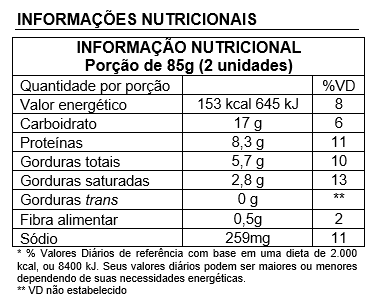 Farinha de trigo enriquecida com ferro e ácido fólico, água, presunto, queijo tipo mussarela, sorbato de potássio e corante natural betacaroteno.